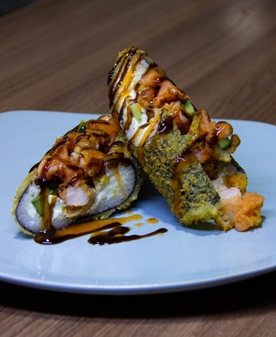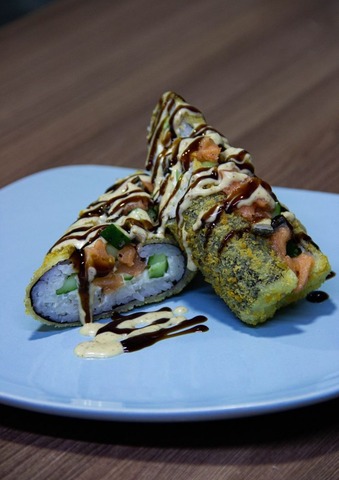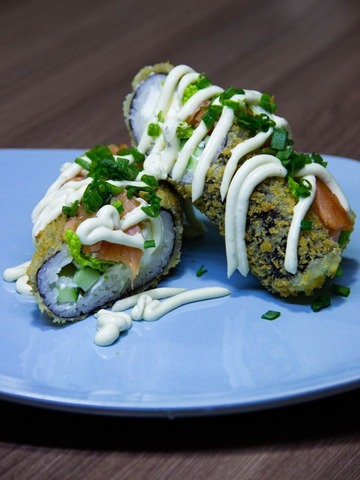 сыр, огурец, лосось, гребешок, соус терияки, соус спайс, криспи лук