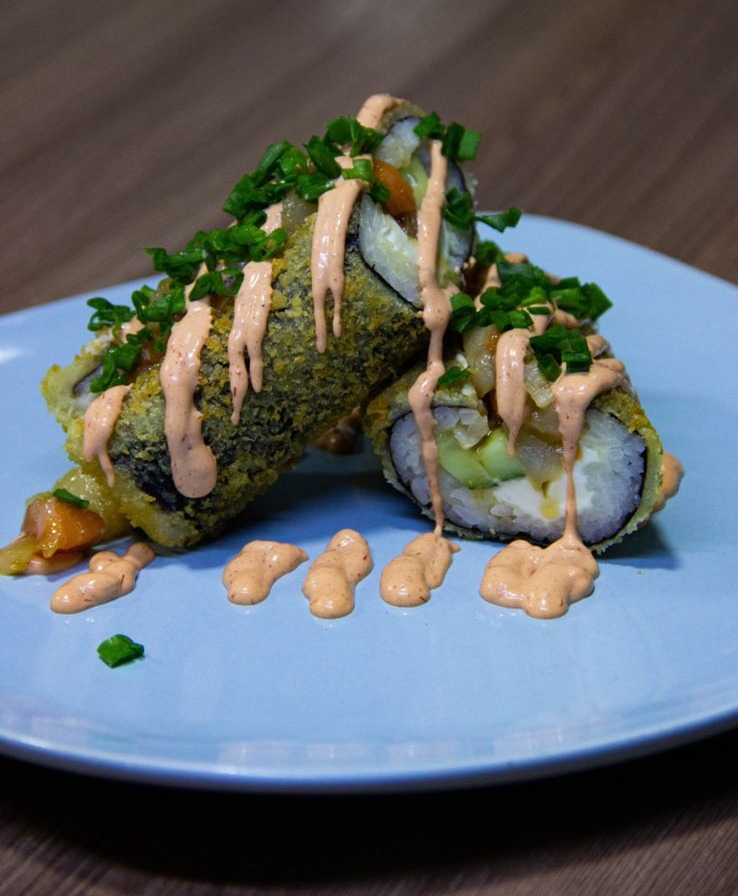 сыр, огурец, лосось, гребешок, соус терияки, соус спайс, криспи лук