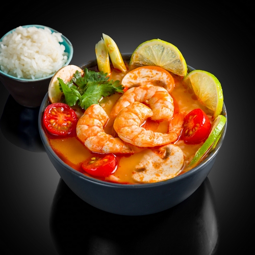 Основа том ям, кокосовое молоко, рис, курица, грибы, лайм, кинза, помидоры, рисовая лапша